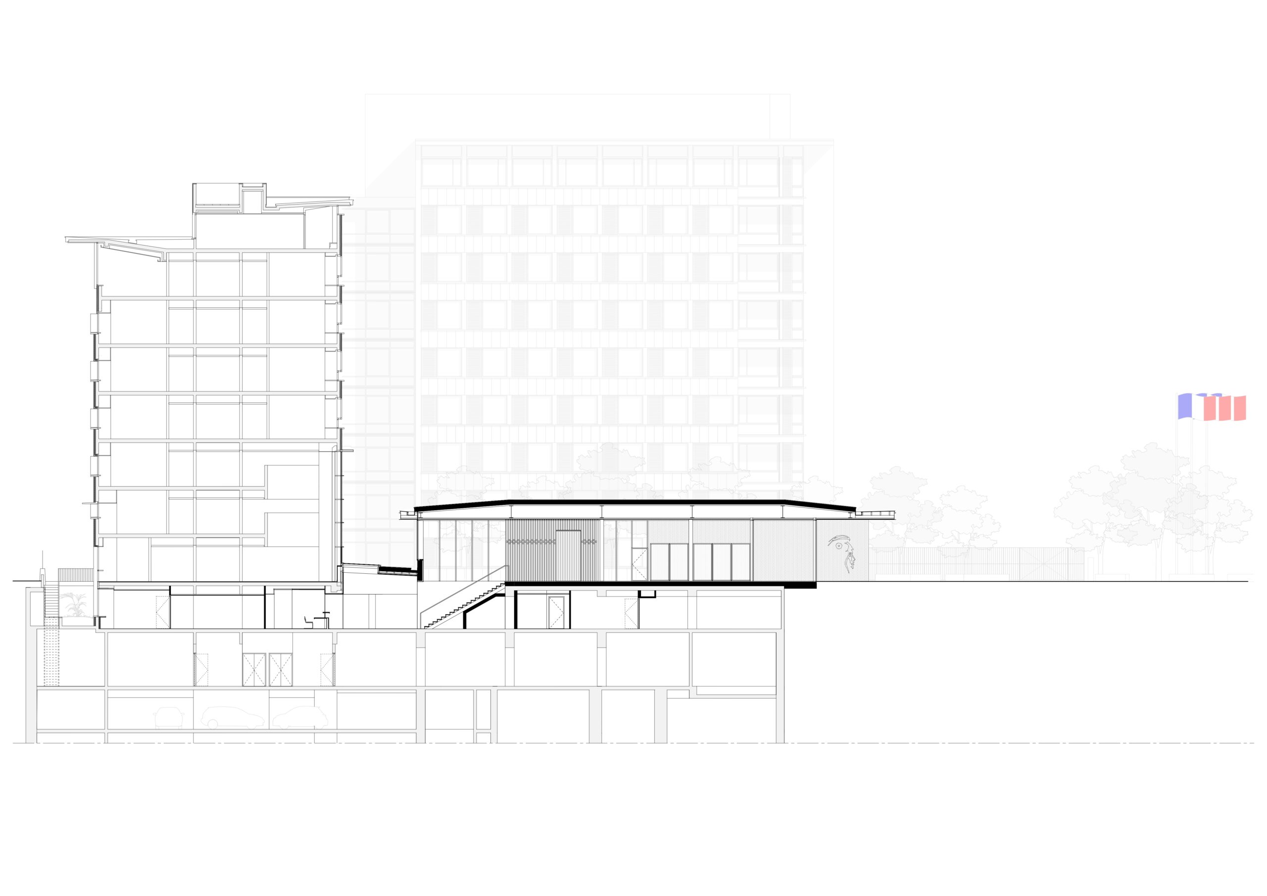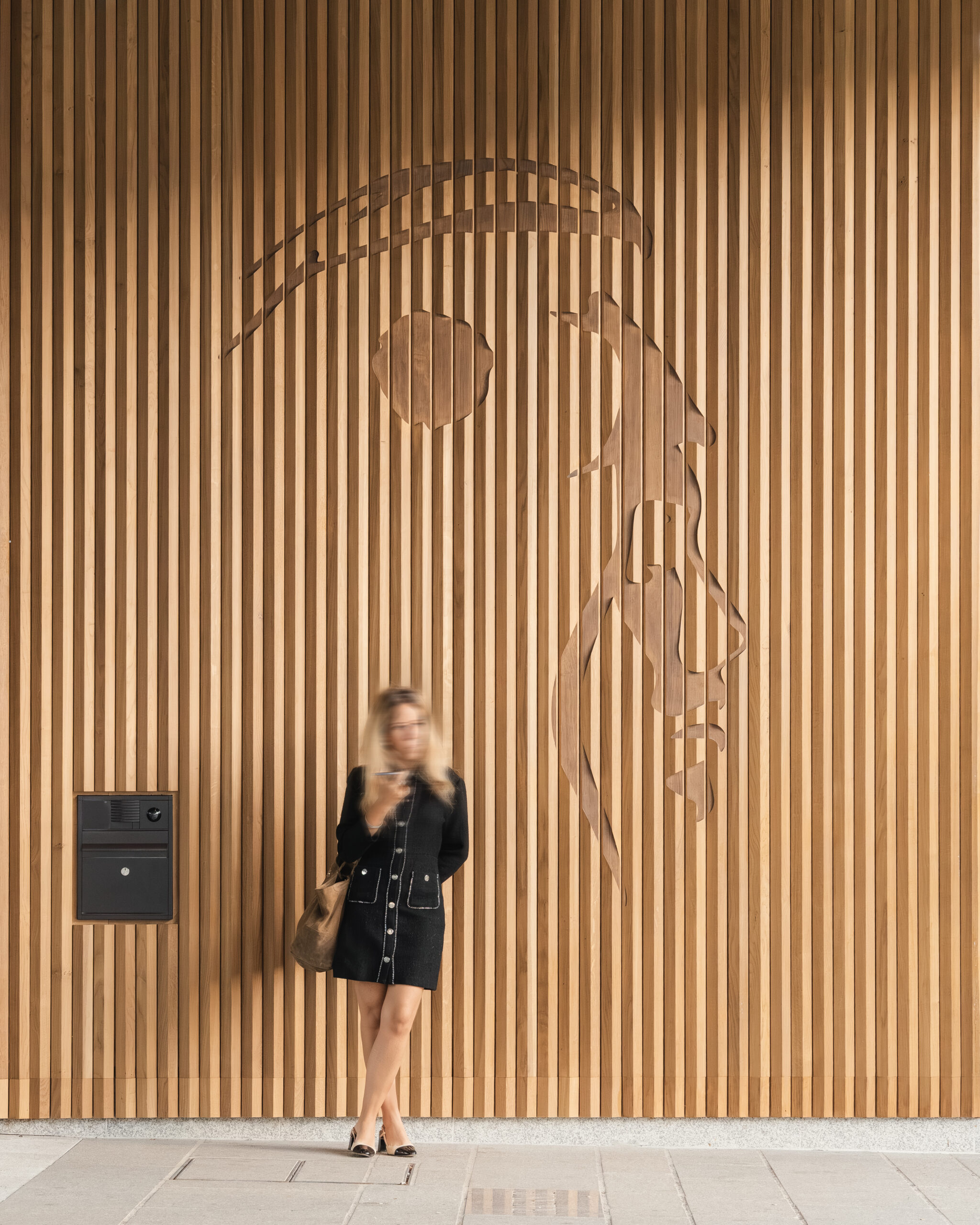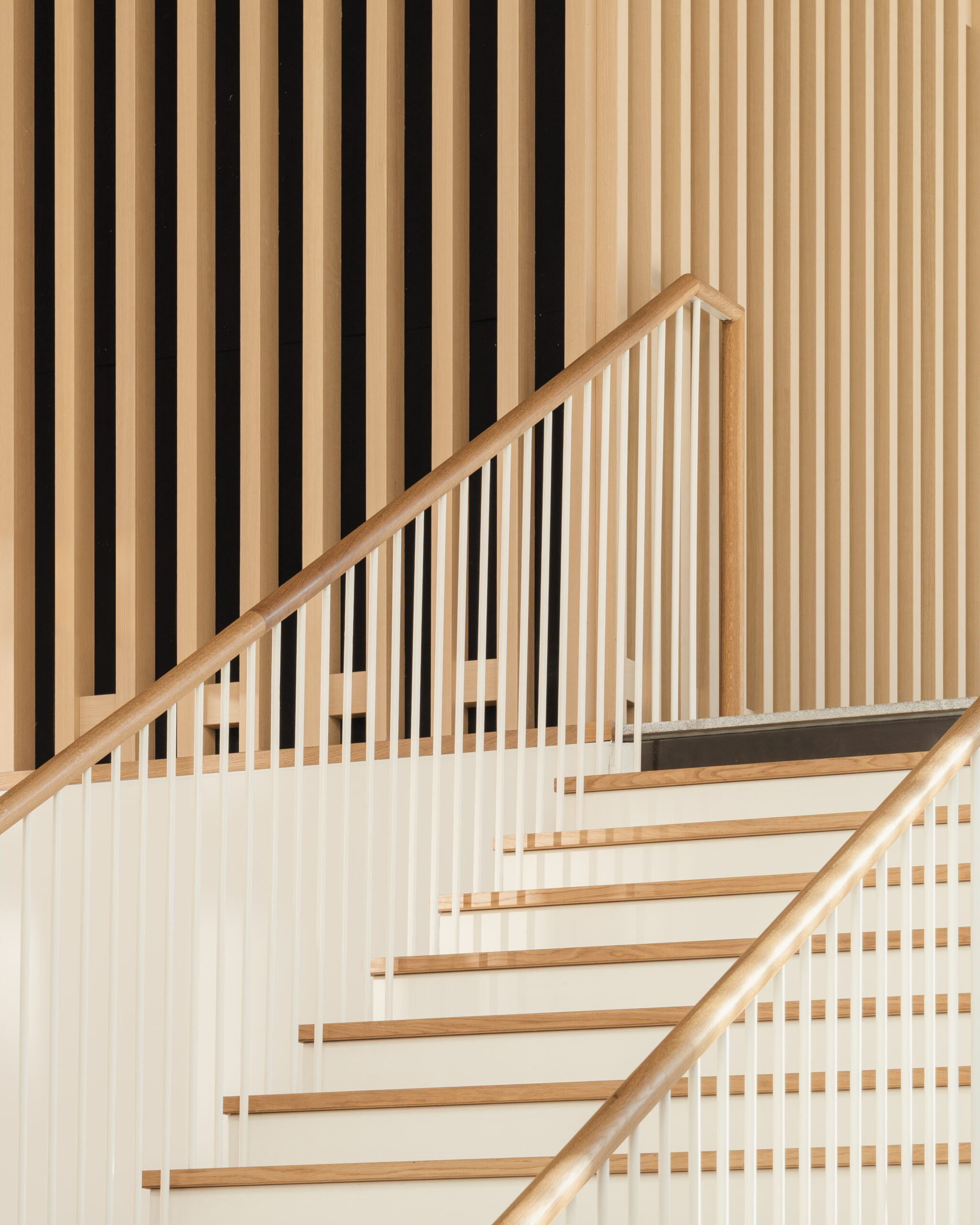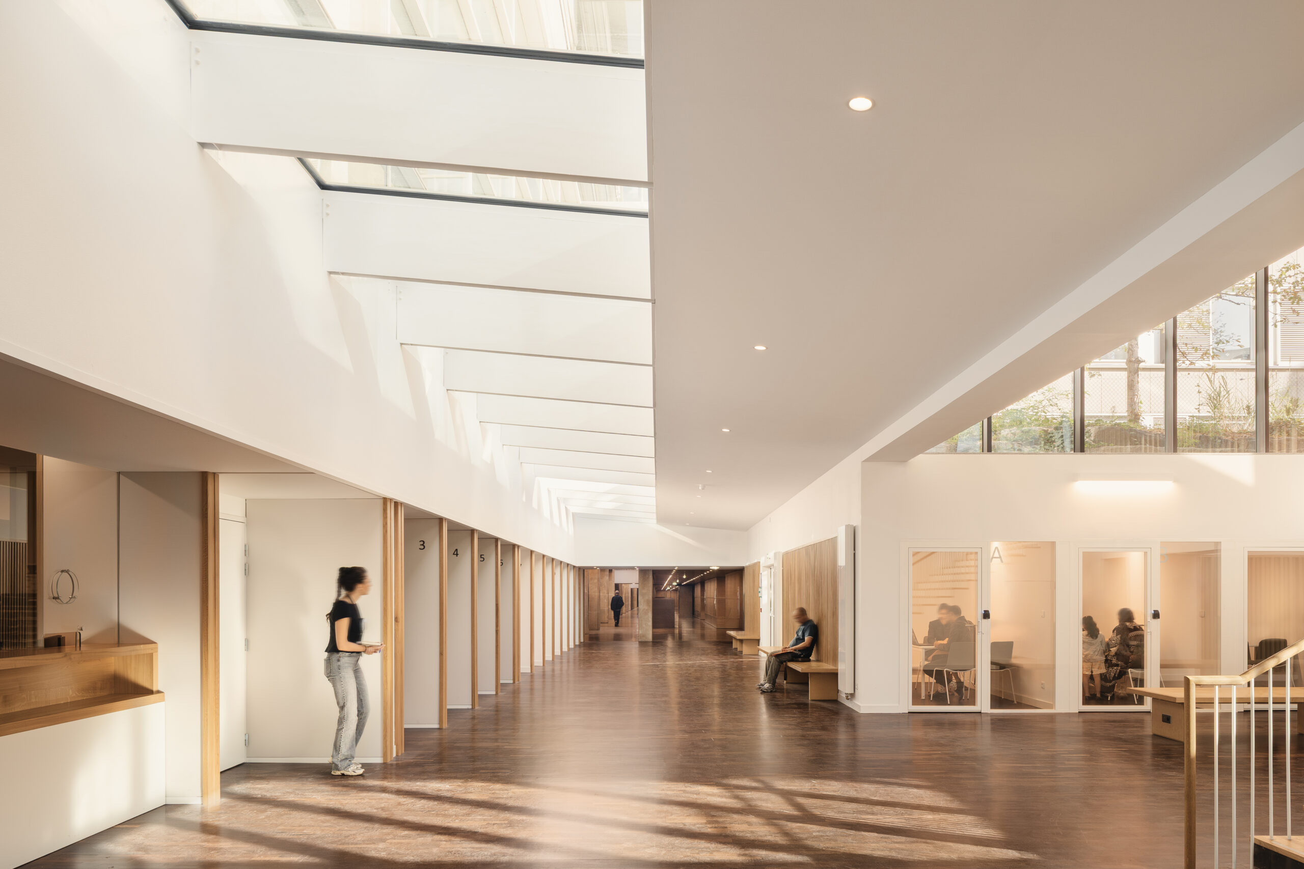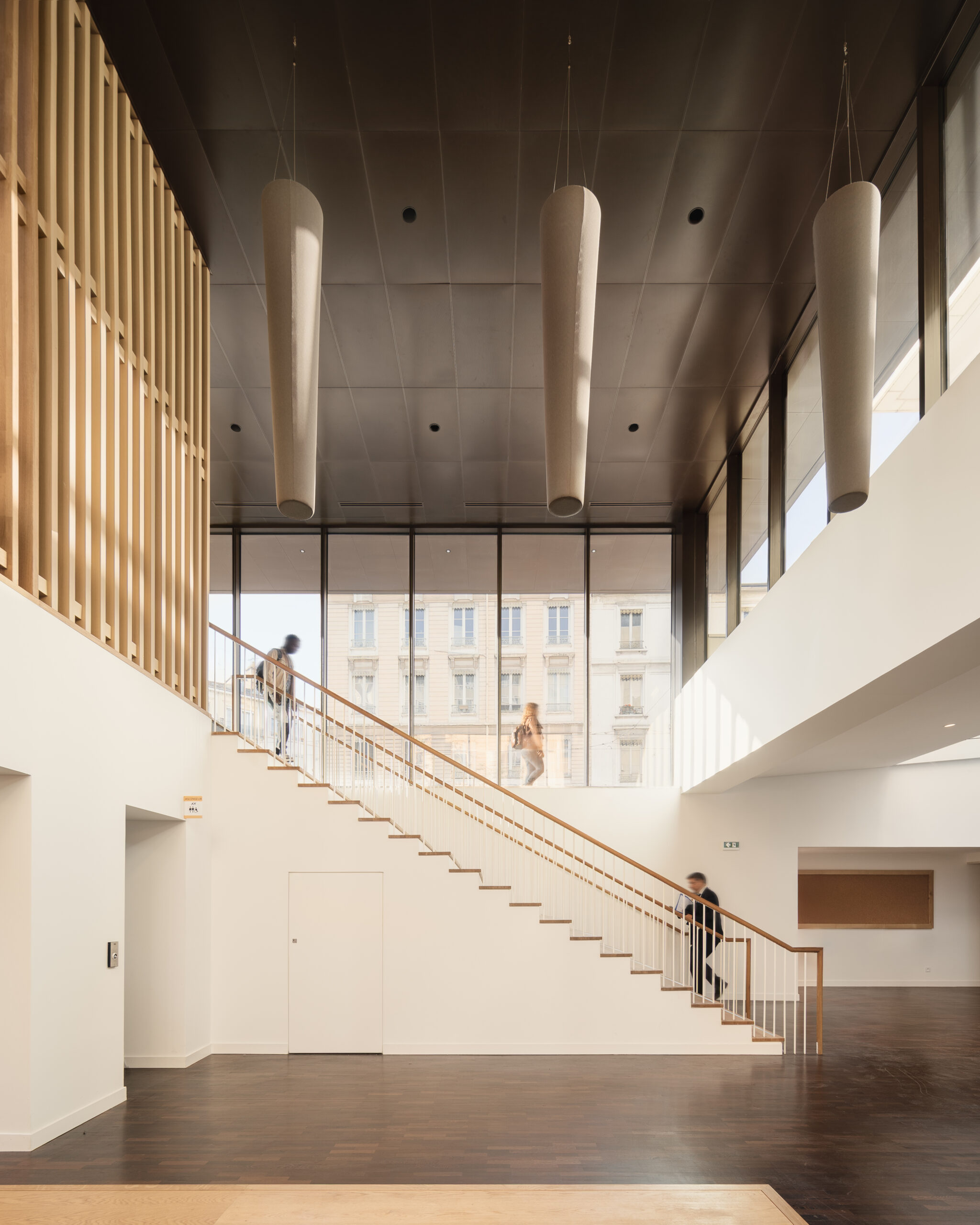 Respecting the existing building, our project distinguishes itself from the current structures while maintaining the reading of the articulations through gaps and recessed joints. This clear separation allows for an independent architectural expression that does not compete with the existing building, while still creating a strong visual impact despite its limited footprint. To meet this challenge, several design strategies are employed: separating the new building from the existing structures, positioning it along the street, the scale of its elements such as the tall glazing, and the cantilever over the main entrance. The emphasis on horizontality and transparency enhances the sense of lightness and fluidity. Inside, the large two-story wooden lantern, combined with the main staircase, connects the entrance to the main hall on the lower level.