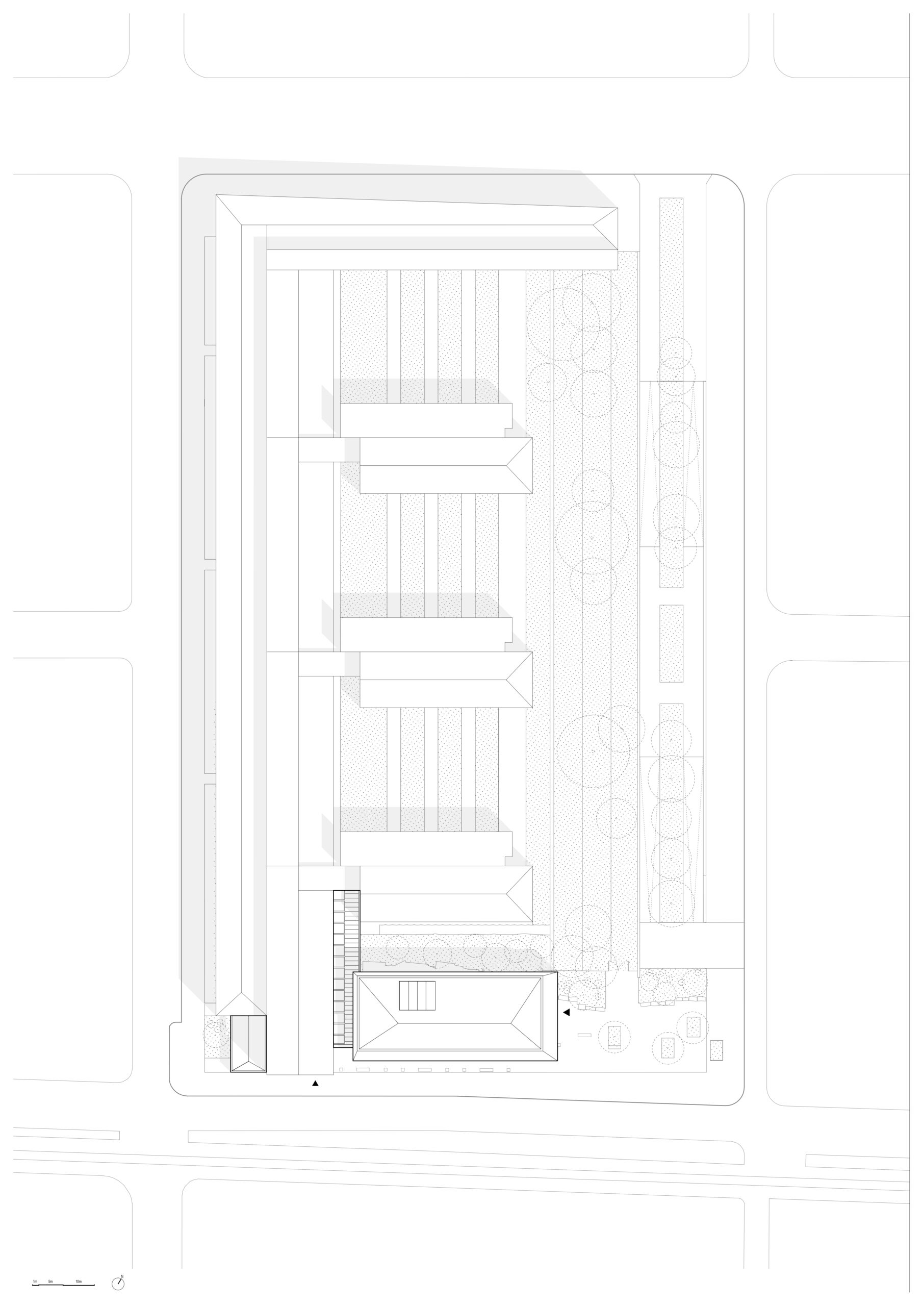 Dans le respect du bâtiment existant, notre projet se détache des constructions existantes tout en maintenant la lecture des articulations par failles et joints creux. Cette dissociation permet de développer une expression architecturale autonome, qui n’entre pas en concurrence avec l’existant tout en créant un signal fort malgré sa surface réduite. Plusieurs dispositifs sont mis en œuvre pour atteindre cet objectif : la dissociation du bâtiment par rapport aux existants, son implantation le long de la voie, l’échelle de ses éléments constitutifs comme les vitrages de grande hauteur, le porte-à-faux sur l’entrée principale. Le choix de l’horizontalité et de la transparence renforce la perception de légèreté et de fluidité. À l’intérieur, la grande lanterne en bois sur deux niveaux associée à l’escalier principal lie l’entrée à la salle des pas perdus du niveau inférieur.